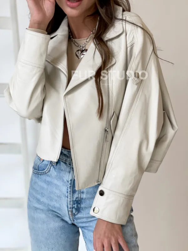 Белая короткая кожаная куртка – выбор девушек с изысканным вкусом. Укороченная модель акцентирует внимание на изяществе фигуры. Оригинальный воротник выгодно подчеркнет грациозность шеи. Натуральная кожа приятна телу и практически не ощущается. Изделие можно носить прохладным летом и теплой зимой.