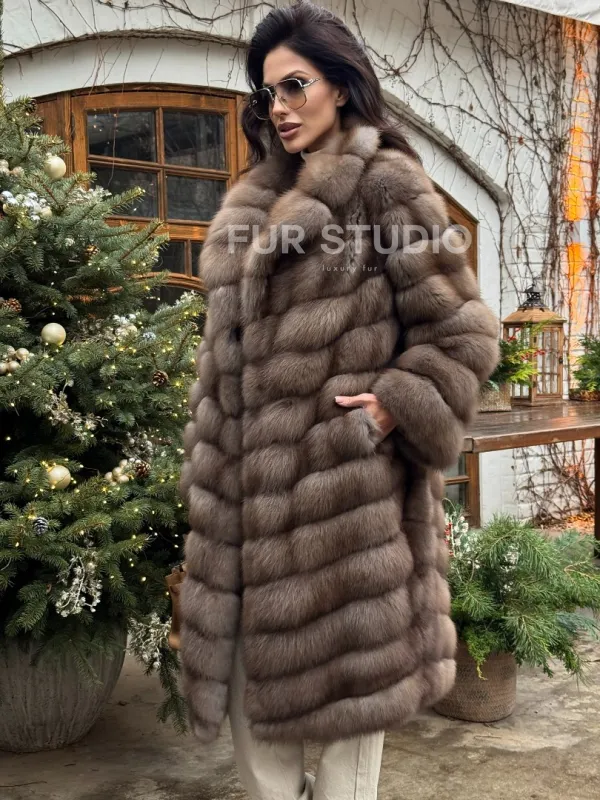 Мех данной шубы лесная куница, цвет натуральный. Предлагается в размерах от 42 до 50. Длина модели 105-110 см, что выгодно подчеркивает фигуру девушек. Эта модель идеально подойдет для девушек и женщин, предпочитающих роскошные натуральные меха.