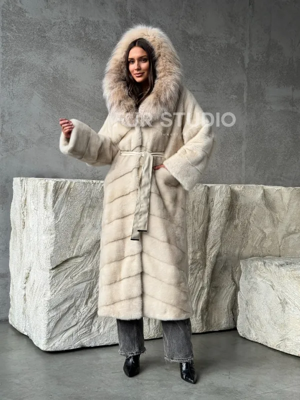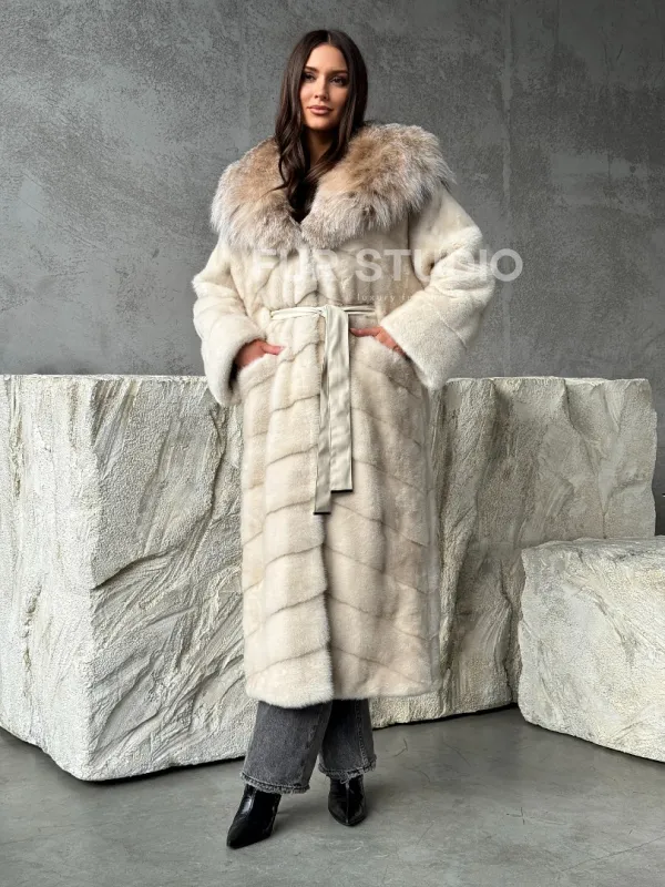 Мех данной шубы аукционная норка, цвет бежевый. Предлагается в размерах от 42 до 48. Длина модели 125-130 см, что выгодно подчеркивает фигуру девушек. Эта модель идеально подойдет для девушек и женщин, предпочитающих роскошные натуральные меха.