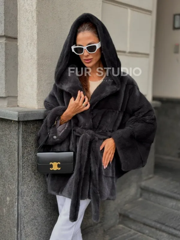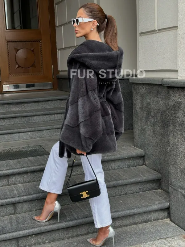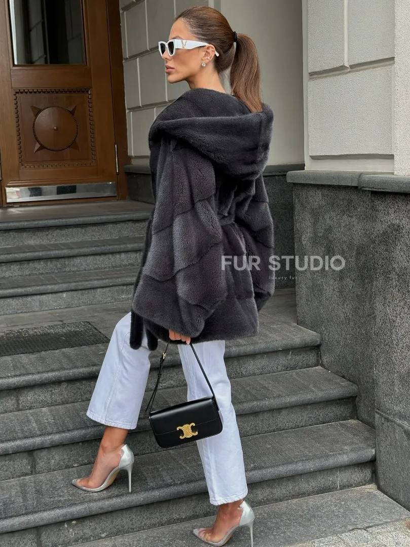 Норковая шуба с капюшоном цвет графит 100522