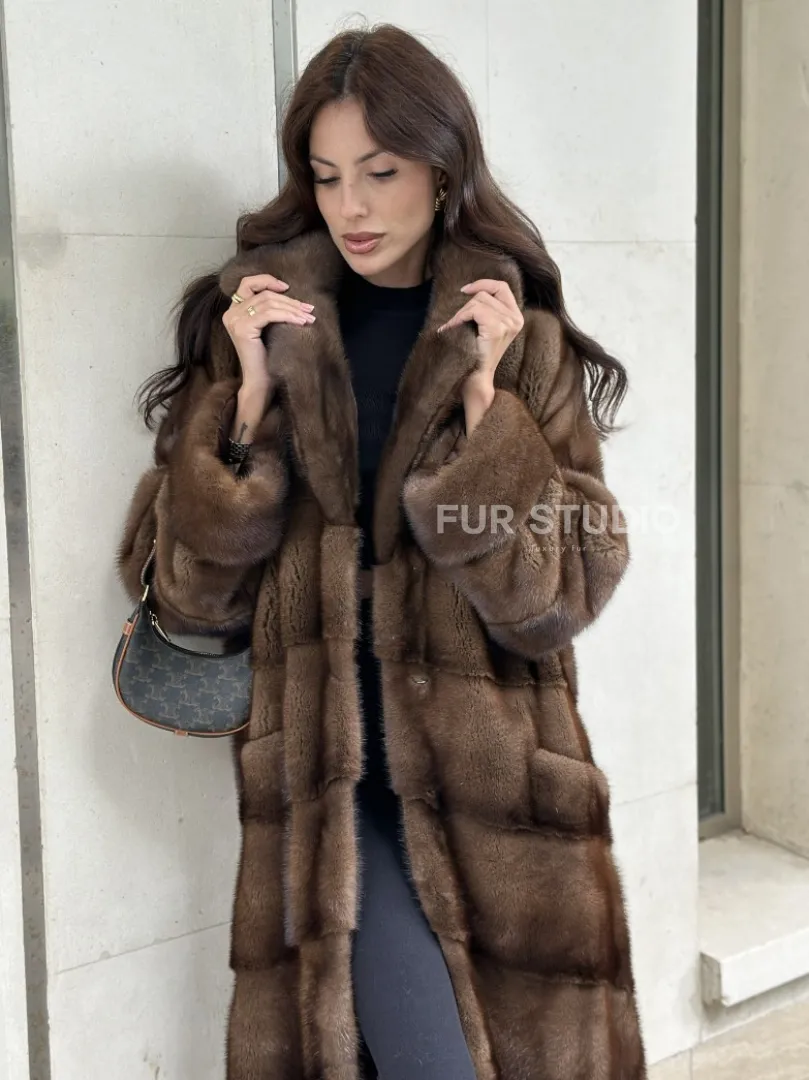 Мех данной шубы аукционная норка, цвет коричневый. Предлагается в размерах от 42 до 66. Длина модели 115-120 см, что выгодно подчеркивает фигуру девушек. Эта модель идеально подойдет для девушек и женщин, предпочитающих роскошные натуральные меха.