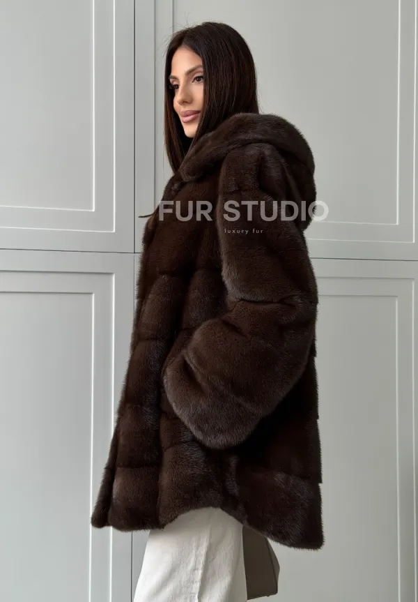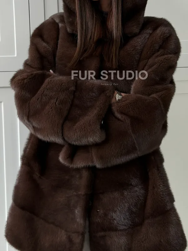 Норковая шуба в стиле «рубашка» с капюшоном 102826