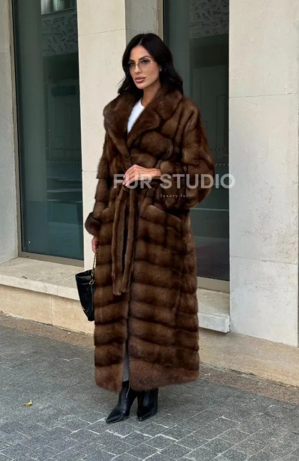Прямой крой зрительно увеличит рост и скроет недостатки фигуры. Меховой пояс выгодно очертит талию и создаст силуэт песочных часов. В шубе вы будете выглядеть женственно и лаконично. Широкие манжеты подчеркнут изящество кистей. Купить норковую шубу в цвете соболь с английским воротником могут девушки, которые разбираются в моде и имеют безукоризненный вкус.