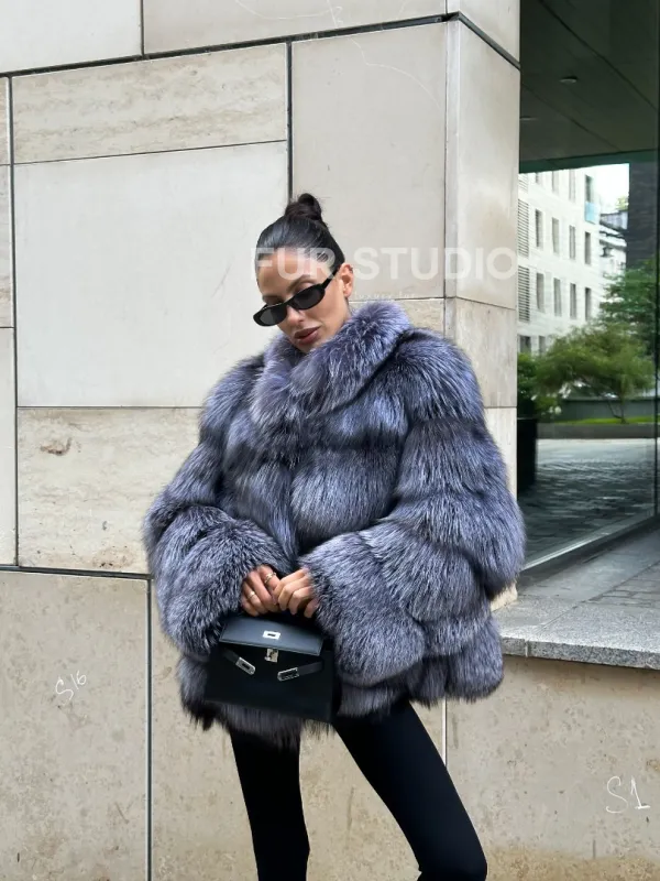 Мех данной шубы лиса, цвет серый. Предлагается в размерах от 42 до 50. Длина модели 60-65 см, что выгодно подчеркивает фигуру девушек. Эта модель идеально подойдет для девушек и женщин, предпочитающих роскошные натуральные меха.