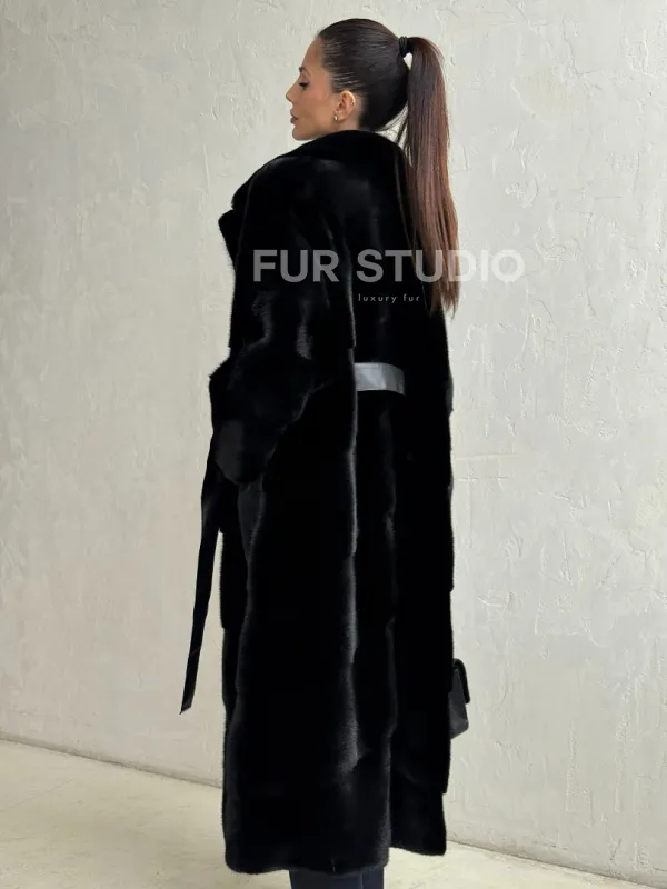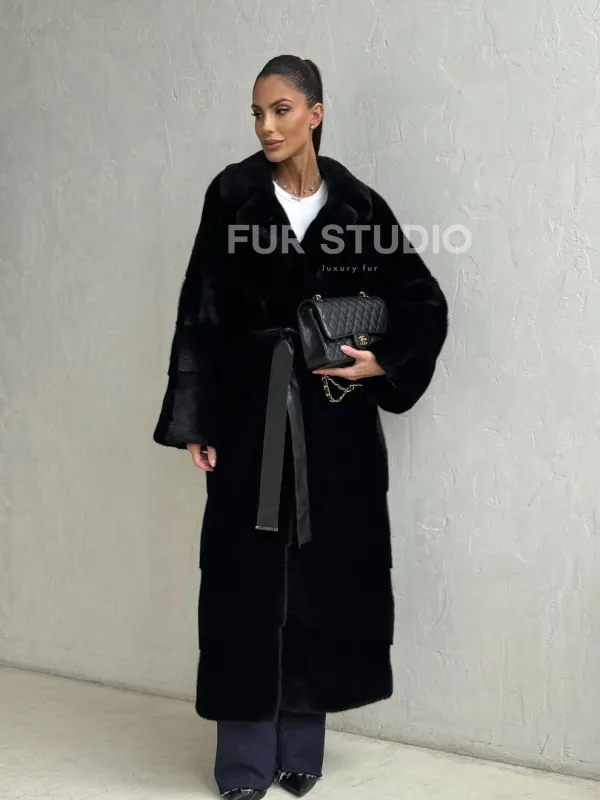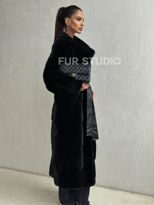 Удлиненная черная шуба с поясом из скандинавской норки – отличное решение для стильных и уверенных женщин, которые знают что хотят. Модель выглядит роскошно, и в ней вы будете собирать восхищенные взгляды. Комфортная длина бережно защитит владелицу в любую непогоду. Меховой пояс выгодно очертит талию. Прямой крой поможет скрыть недостатки фигуры. Изделие подходит девушкам любого возраста и типа фигуры.