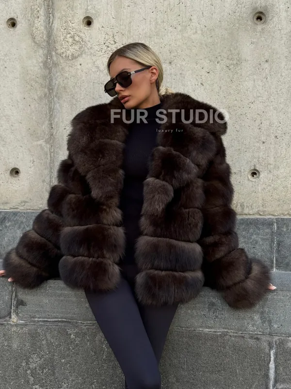 Мех данной шубы финский песец, цвет коричневый. Предлагается в размерах от 42 до 48. Длина модели 60-65 см, что выгодно подчеркивает фигуру девушек. Эта модель идеально подойдет для девушек и женщин, предпочитающих роскошные натуральные меха.