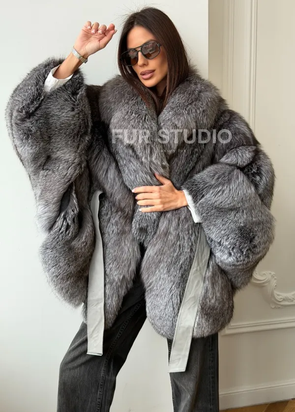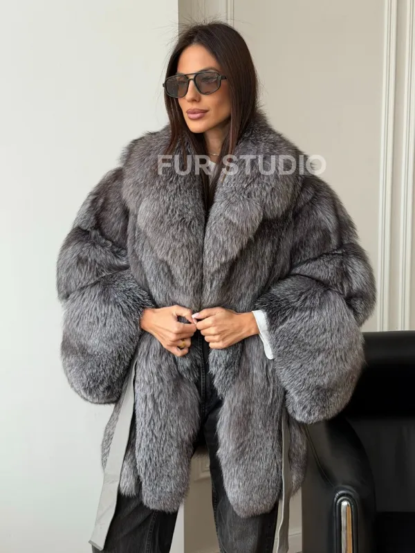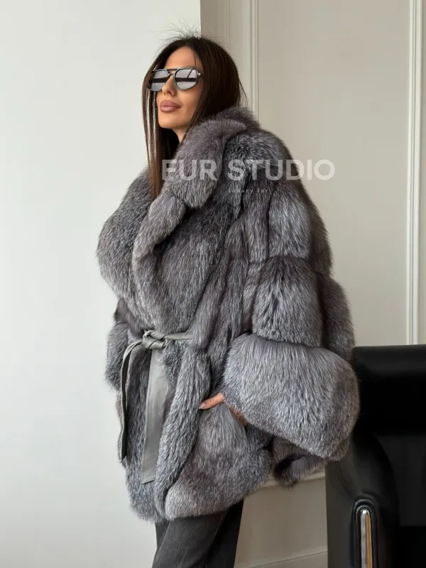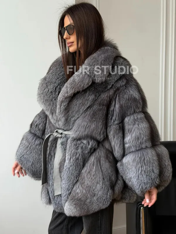 Мех данной шубы лиса, цвет серый. Предлагается в размерах от 42 до 52 (oversize). Длина модели 75-80 см, что выгодно подчеркивает фигуру девушек. Эта модель идеально подойдет для девушек и женщин, предпочитающих роскошные натуральные меха.