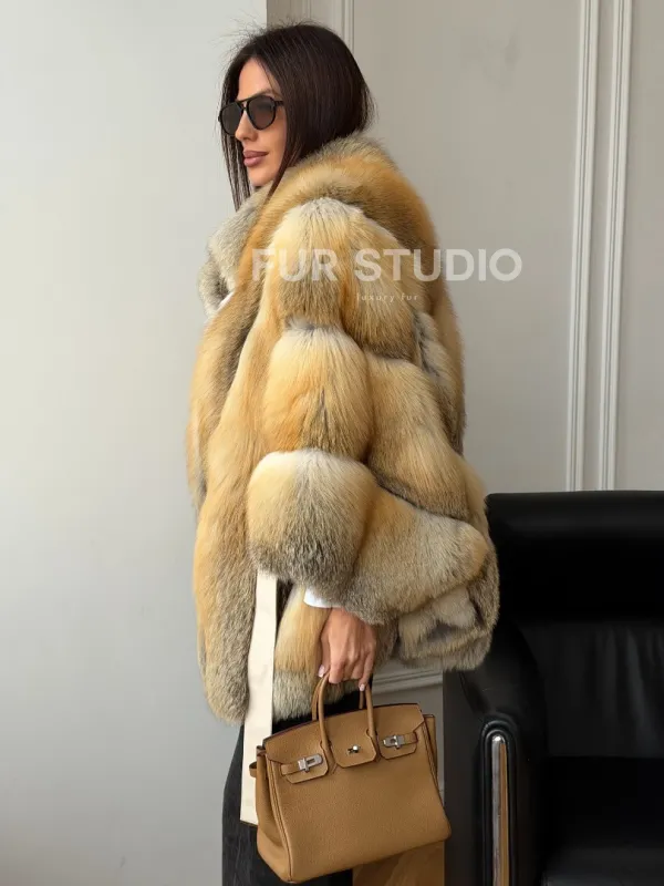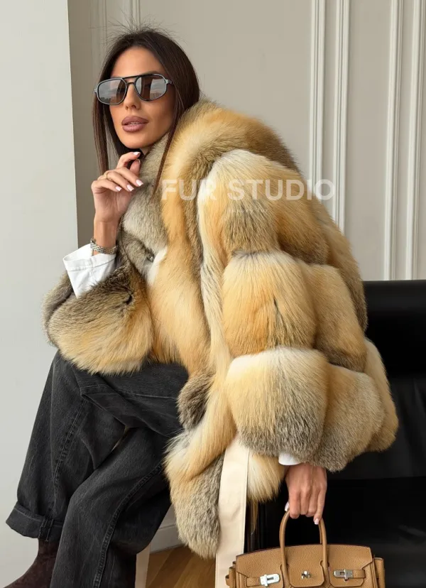 Мех данной шубы лиса, цвет рыжий. Предлагается в размерах от 42 до 52 (oversize). Длина модели 75-80 см, что выгодно подчеркивает фигуру девушек. Эта модель идеально подойдет для девушек и женщин, предпочитающих роскошные натуральные меха.
