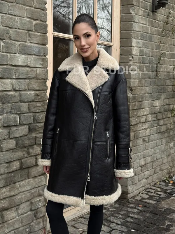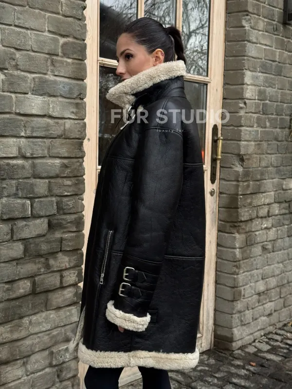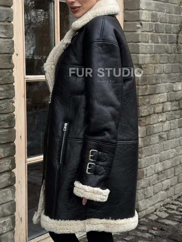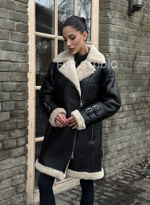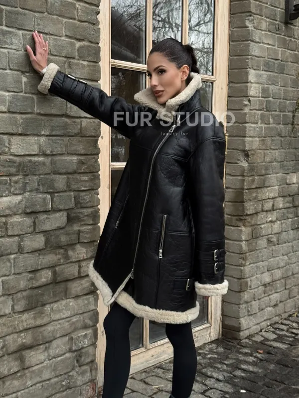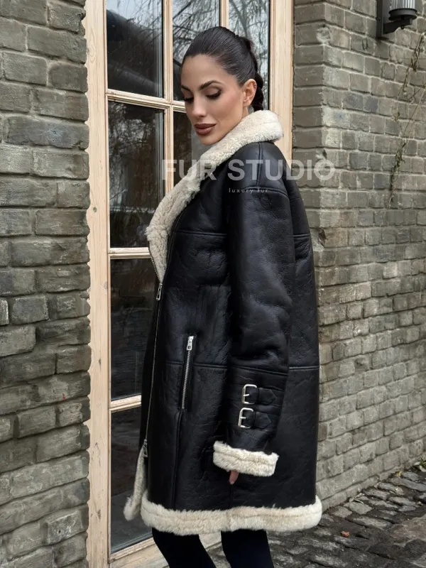 Удлиненная дубленка на белой овчине 100254